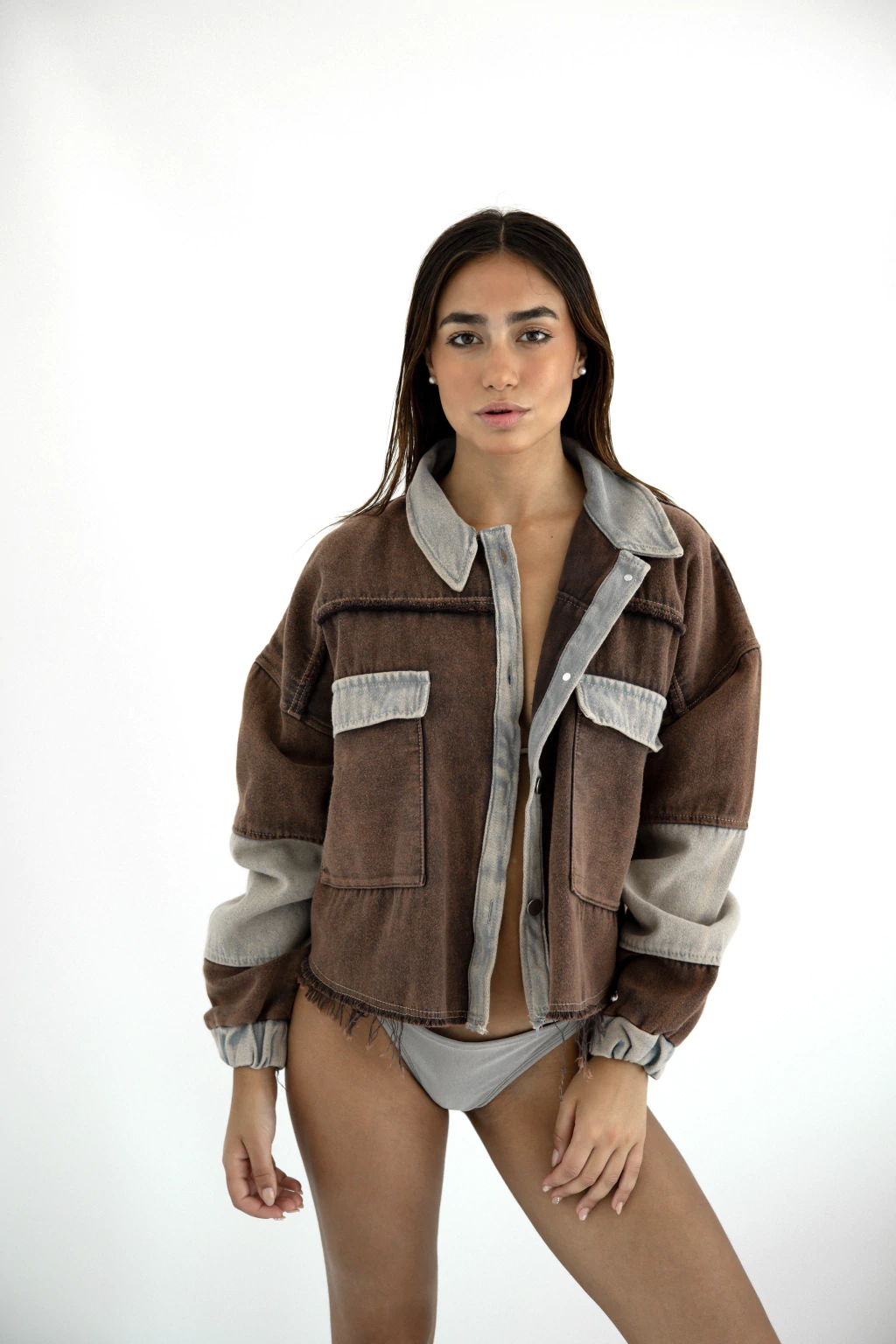 Cada pieza pasa por un proceso artesanal de desgaste, por lo que las tonalidades pueden variar en intensidad, y los flecos desiguales aparecen en mayor o menor cantidad según la prenda.